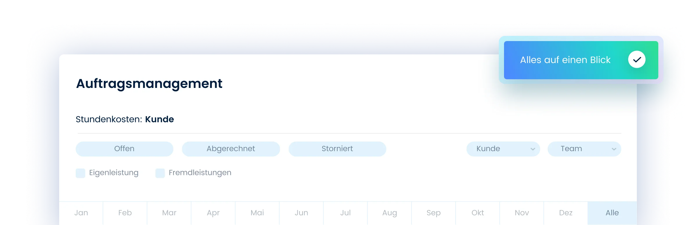 Im Auftragsmanagement haben Sie alles im Blick: Projekte, gebuchte Stunden, Budgets, Eigenleistungen, Fremdleistungen uvm…